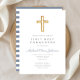 Convite Moderno da Primeira Comunhão de Blue Cross Boy. Parte do Pacote de Primeira Comunhão do Cruzeiro Dusty Blue Script Cross Boy com artigos de papelaria e acessórios de primeira comunhão.