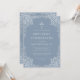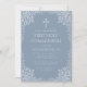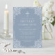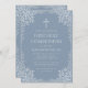 Este elegante e empoeirado primeiro convite à comunhão azul com ar vintage, recomendado para um menino, tem um ornamentado falso de folha prateada com folhas de cinza de prata em um fundo azul empoeirado. Acima do texto, há uma cruz religiosa em folha de prata falsa. Todo texto pode ser personalizado e tem uma cor de cinza semelhante à falso quadro prateado. A safra, ornamentado de folhas de ouro é baseada em um antigo enlace de cobrir de livros, "O século XVIII Suas Instituições, Alfândegas e Figurinos" de Paul LaCroix, publicado em 1876, agora no dominio público.