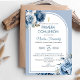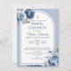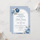 Convide familiares e amigos para celebrar a Primeira Comunhão do seu filho com este convite lindamente desenhado. A cruz dourada e as flores azuis adicionam um toque elegante e religioso a este cartão temático católico.