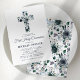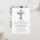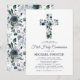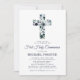 Elegante convite de primeira comunhão com um fundo branco simples que pode ser alterado para qualquer cor, uma cruz religiosa floral em aquarela azul e um modelo moderno que é fácil de personalizar.