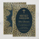 Este convite de primeira comunhão elegante com um ar vintage tem uma moldura dourada antiga com decorações de folhas de ouro espiraladas em um fundo azul-marinho escuro. O texto está dentro de uma oval com borda dourada e tem uma cruz de ouro acima dele. O nome do menino é escrito em uma fonte caligráfica elegante. Todo o texto pode ser personalizado e tem uma cor dourada semelhante às decorações de ouro da moldura.
