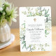 Composto por tipografia serif. Tudo contra um pano de fundo branco com folhagem de folha verde com cruz dourada. A parte traseira da carta tem um design de painel de madeira.