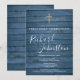 Um convite rústico para a primeira comunhão, apresentando uma elegante cruz dourada e o nome em caligrafia sobre um fundo de painéis de madeira azul. Personalize com as informações do seu evento especial em tipografia sofisticada. Desenhado por Thisisnotme©