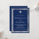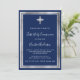 Um moderno, elegante e convite. Um fundo azul marinho decorado com uma cruz, falso armação prateada. Personalize e adicione um nome e detalhes. Texto branco.