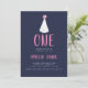 Um primeiro convite de aniversário moderno para sua garotinha em marinho, rosa, com um chapéu de pompom de aquarela, letra escrita com pincel e padrão de risca diagonal no reverso.
