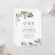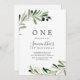 Este moderno convite para o primeiro aniversário da oliveira é perfeito para uma festa de aniversário de boho. O design rústico, porém elegante, apresenta folhas botânicas de cor aquática simples e azeitonas pretas num pequeno galho com um toque mediterrânico clássico.