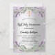 Um convite moderno, na moda e glamouroso para uma Primeira Comunhão Santa. Um fundo de aparência pura prateada com brilho violeta, faíscas, flores de lavanda, flores e verde de eucalipto. O nome é escrito com um moderno estilo escrito à mão. Personalize e adicione seus detalhes.