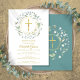 Uma terra verde decorativa e uma cruz de ouro acima da sua primeira e sagrada informação de convite sobre esta elegante design.