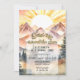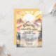 Boho e design de 1º aniversário, rústico e neutro, "Primeira viagem ao redor do sol" com uma paisagem ao estilo aquarela com montanhas, árvores de abeto e um sol ascensão.