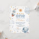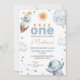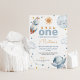 Sun Space First Trip Around the Sun primeiro aniversario Invitation Sweet outer space ou first trip round the sun first aniversy for a baby boy apresentando um pequeno sol, planeta, estrelas, nave espacial e homem espacial. A primeira viagem deste rapaz ao redor do sol é ideal para uma primeira festa de aniversário espacial.