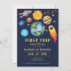 Começamos as celebrações do primeiro aniversario em estilo com esses convites de festas 'Primeira viagem ao redor do sol'. Os convites podem ser personalizados com a inclusão do nome e dos detalhes da sua pequena festa. Este é um convite de aniversário temático para o espaço aquático ideal para o amante do espaço na sua vida. O design apresenta um foguete, o sol e planetas e estrelas. O verso do convite está em azul escuro com um padrão de estrelas.