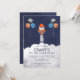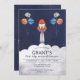 Convite de festas de espaço moderno do primeiro aniversario. O espaço inspirou a primeira viagem ao redor do sol com planetas aquosos e um foguete.