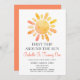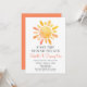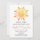 Um doce sol brilhante, estilo jato de ouro laranja, com raios, primeira viagem ao redor do sol, convite de aniversário de criança estilo aquarela. Uma cor d'água laranja esmagada e arrojada.