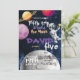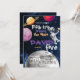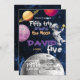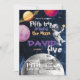 Um convite de aniversário de espaço temático em cores brilhantes, uma lua uma galáxia com planetas e um astrônomo fofo à procura de novas estrelas.Para um cartão moderno Na moda temático com uma fonte no espaço azul com estrelas e um atributo integral do partido, texto personalizado que é facilmente editado.Aniversários de criança são especiais, e este convite pode ajudá-lo a fazer uma festa de aniversário memorável.