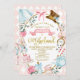 Arco branco rosa Alice Onederland primeiro aniversario Invitation Sweet Alice em uma terra que recebeu o primeiro convite de aniversário apresentando um padrão de diamante rosa, arco e faixa cor-de-rosa e vários itens da história. Este convite para primeiros aniversarios da Terra apresenta também um título decorativo falso de caligrafia em ouro e um pequeno coração.