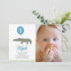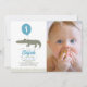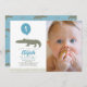 Este belo convite de fotografia de primeiro aniversario "chomp! chomp! chomp!" de criança/menino apresenta um crocodilo/crocodilo com um balão azul. O verso apresenta um fundo azul com padrões de crocodilo/crocodilo. Personalize para suas necessidades. Você pode encontrar produtos correspondentes na minha loja.