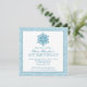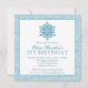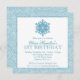 Um primeiro convite de aniversário do país das maravilhas moderno do inverno. Caracterizando o falso brilhe e floco de neve no azul da cerceta. O design é gráficos impressos plano - BRILHO NAO REAL.