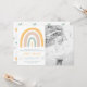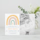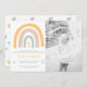 Um convite de aniversário bonito para a sua menina perfeita para primavera. Essa design apresenta um arco-íris moderno em cor-de-rosa e lacrimejo pastel, com pop de amarelo-mostarda, com sua idade no centro. Personalize com uma foto da sua pequena, e os detalhes da festa embaixo, em chalé amarelo e pastel. O reverso apresenta um padrão de queda de corações pastéis.