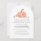 Convide seus convidados para comemorar o primeiro aniversário do seu filho com este belo convite rústico apresentando uma abóbora de queda de aquarela com a palavra "Nossa abóbora está virando um!" e seus detalhes de festa na frente. Uma abóbora menor sobre um plano de fundo de madeira rústica que coordena a corrida está atrás.