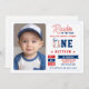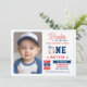 Celebre o primeiro ano do seu bebê com este adorável convite fotográfico temático de baseball, com sotaques vermelho e azul marinho audaciosos, um fundo listrado, e um dentro gráfico de boné de beisebol lúdico, a palavra "UM". Projetado em um layout horizontal, este design divertido e esportivo inclui um modelo de foto personalizável, fazer que facilita a exibição do mais bonito snapshot do seu pequeno enrolador. Ideal para um novato do ano, uma celebração com tema esportivo, ou uma festa de aniversário de beisebol, este convite é perfeito para os pais planejarem um primeiro evento memorável. Personalize com o nome do seu filho, informações da festa e detalhes de RSVP para uma manutenção única.