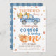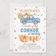 Blue Orange One Pumpkin Truck primeiro aniversario Convite à apresentação de folhas de abóbora de menino azul, castanho e laranja, e pilhas de convite para o primeiro aniversário de feno. Este primeiro convite de aniversário do tema do outono apresenta um caminhão de abóbora azul, uma abóbora laranja grande como parte da palavra um e algumas folhas do outono. Este primeiro convite de aniversário para o caminhão de abóbora no outono é ideal para uma primeira festa de aniversário no outono.