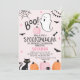 Ghost Spooktacular, cor-de-rosa, primeiro aniversario de Dia das Bruxas Convidando a garota moderna do Dia das Bruxas, convite de primeiro aniversário, com um fundo cor-de-rosa, com vários abóboros rosa e laranja, gato preto, morcego e muito mais. Este convite de primeiro aniversário spookatular do Dia das Bruxas é um doce design para uma festa de aniversário de outubro e excelente de um primeiro aniversário de uma menina.