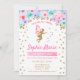 Fada Primeiro Convite de aniversário. Design bonito em ouro brilhante com sotaque floral. Convidar cartão com estrelas de fada de fada reluzente e fonte de script. Púrpura, cor-de-rosa lavanda, cor-de-rosa e branca. Perfeito para uma comemoração mágica de 1rua.