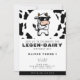 convite de festas de primeiro aniversario branco e preto legal com impressão de vaca vestindo óculos de sol. Personalize-o com os detalhes do evento.