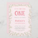 Este convite para o primeiro aniversario apresenta um quadro floral cor-de-rosa e verde, enfeitado com borboletas.