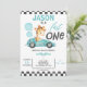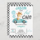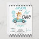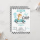 Blue Racing Car Balões Girafa primeiro aniversario Convite para crianças de corrida Cute O primeiro convite de aniversário com um carro de corrida azul, girafa fofa, balões azuis e bandeiras. Este convite de aniversário rápido para um carro de corrida também apresenta um padrão verificado preto-e-branco e um texto de caligrafia moderno. Excelente para o carro de corridas vermelhas de um garotinho no primeiro aniversário.