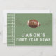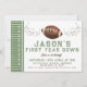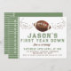 Primeiro aniversario de Jogo Verde Marrom de Futebol Convidado Jogo Feliz Jogo de Primeiro aniversário convite tematizado para um menino que apresenta alguns lados e linhas finais, um futebol marrom e alguns desenhos de jogos. Todo texto é editável.