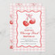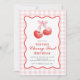 Primeiro aniversário de cereja com arco rosa e gingham rosa.