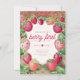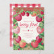 Um convite fofo, doce e na moda para uma festa de primeiro aniversario de menina, com um tema "primeiro" de morango, com um morango fofo que faz parte de uma moldura temática de morango com morango de aquarela em várias cores de coordenação (vermelho, rosa etc.) em um grande campo de morango. O título, "Berry First", está na caligrafia moderna. No verso, um padrão de gingham baleado em vermelho e branco. Um adorável quadro de fruta doce de aquarela para comemorar o primeiro aniversário da sua amora.