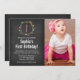 Um quadro de flores primeiro convite de aniversário. Apresentando uma ilustração de cor azul esbranquiçada em tons ou rosa, verde e lacrimogêneo. Personalize facilmente a foto e a informação do seu filho.
