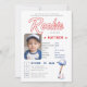Celebre o seu jogador de testa, com este divertido convite de primeiro aniversário no tema do beisebol! Apresentando uma faixa ousada de "novato do ano", um espaço para a foto do seu filho, e estatísticas personalizadas divertidas (como "BATS: WITH CAKE"), esta design tira-a do parque. Uma ilustração encantadora de aquarela de um taco de beisebol com um boné no topo e uma bola nas proximidades adiciona um toque esportivo e leve. Com sotaques clássicos vermelhos e azuis marinho, este convite é perfeito para uma grande celebração da família que ama o beisebol.