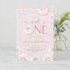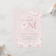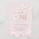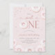Rosquinhas cor-de-rosa-claro, um convite de festas de primeiro aniversario. Design de tendências cegas com rosquinhas cor-de-água rosa e branca. Possui fonte de script cardíaco e letra de tipografia 1. Você pode escolher convites impressos e/ou fazer o download instantâneo do modelo digital. Perfeito para uma na moda feminina comemoração do primeiro dia.