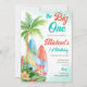 Primeiro aniversario de surfe, o grande convite para modelo de download instantâneo. Palmeira, conselhos surfs, plantas tropicais, fonte retrô para praia, surfe, festa de aniversário tropical.
