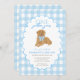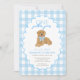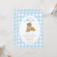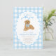 Celebre o seu primeiro aniversário com este charmoso convite de "Um Ouro Ano" com um adorável filhote de ouro a vestir um arco de gingham azul. O fundo mostra uma borda azul-clara, com um punho branco escamoteado, perfeita para a primeira festa de aniversário de um menino. Totalmente personalizável com o nome do seu filho, os detalhes da festa e as informações de RSVP.