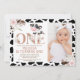 Rosa Dourado Uma Foto primeiro aniversario Floral de Vaca Convite Raparigas vacas recebeu o primeiro convite de aniversário com uma falsa palavra de ouro rosa adornada com flores, dois maiores arranjos florais cor-de-rosa e um livro-padrão de impressão preto. O primeiro convite de aniversário para a vaca desta menina é ideal para a primeira festa de aniversário do tema da vaca.