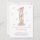 um convite floral doce com as flores dispostas sob a forma do número "1" em tons pastéis de amarelo, coral, rosa e lavanda. O verso será impresso com um padrão de faixas de coordenação.