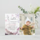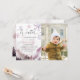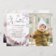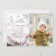 Cartão de convite de aniversário de moça moderna, com arte aquosa da montanha de inverno com pinheiros com flocos de neve. O texto diz "Winter ONEDERLAND". Perfeito para o primeiro aniversário de uma garota no inverno. Adicione uma foto a esta design.
