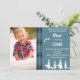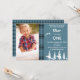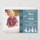 Uma lenhadora de cinza azul, convite de festas temático para a festa do primeiro aniversario de um menino. Insira sua foto vertical do aniversariante! Modelos para nome, idade 1 e detalhes da festa. Padrão de flanela de xadrez azul e preta, silhoettes de floresta e de vida selvagem em branco. Árvores, alce, coelho, raposa e águia. Cartas brancas.