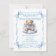 Convite para primeiro aniversario com um ursinho de pelúcia fofo, balões e cupcake em azul claro e bege. Design bonito para o primeiro ou qualquer aniversário de um menino. Personalizar facilmente todo o texto, incluindo o número do Aniversário.