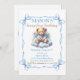 Convite para primeiro aniversario com um ursinho de pelúcia fofo, balões e cupcake em azul claro e bege. Design bonito para o primeiro ou qualquer aniversário de um menino. Personalizar facilmente todo o texto, incluindo o número do Aniversário.