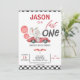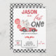 Carro Vermelho Balões Elefantes Convite para primeiro aniversario de Elefante Um boneco de garotinho foi chamado de primeiro aniversário com um carro de corrida vermelho, elefante fofo, balões vermelhos e bandeiras. Este convite de aniversário rápido para um carro de corrida também apresenta um padrão verificado preto-e-branco e um texto de caligrafia moderno. Excelente para o carro de corridas vermelhas de um garotinho no primeiro aniversário.