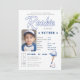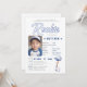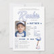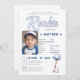 Celebre o seu jogador de testa, com este divertido convite de primeiro aniversário no tema do beisebol! Apresentando uma faixa ousada de "novato do ano", um espaço para a foto do seu filho, e estatísticas personalizadas divertidas (como "BATS: WITH CAKE"), esta design tira-a do parque. Uma ilustração encantadora de aquarela de um taco de beisebol com um boné no topo e uma bola nas proximidades adiciona um toque esportivo e leve. Com sotaques clássicos vermelhos e azuis marinho, este convite é perfeito para uma grande celebração da família que ama o beisebol.