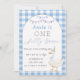 Celebre o seu primeiro aniversário com este convite delicioso e caprichoso! Apresentando um ganso doce vestindo um chapéu festivo e arco, aliado a um beliche pastel lúdico, este design dá o tom para um encontro divertido e memorável. O fundo azul e branco de verificação adiciona um toque fresco e alegre, fazer este convite perfeito para uma celebração acolhedora e de retorno. 🎈 Adicione um pouco de silêncio e alegria ao seu dia especial. Peça agora e torne isso realmente inesquecível! 🎉 🌟