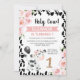 Impressão de Vaca Floral, Cor-de-Rosa Negra, primeiro aniversario de Vaca Floral, Convite para vaca em-frade Primeiro Aniversário para uma menina que apresenta uma vaca branca e negra, um padrão de impressão de vaca ousado, faixa rosa e alguns adoráveis rosas florais rosa. Este primeiro convite de aniversário para vacas loucas, sagradas e negras, é ideal para uma primeira festa de aniversário temática de vacas.