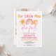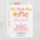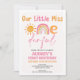 Cor-de-rosa Sun Rainbow Miss primeiro aniversario Incêndio Maravilhoso Brilhante coloriu nosso pequeno convite de primeiro aniversario para uma menina apresentando um sol, arco-íris e texto em rosa-quente e laranja. Esta garota perdeu um maravilhoso primeiro convite de aniversário tem uma foto nas costas.