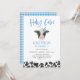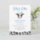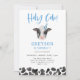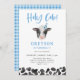 Cartão de convite de aniversário de menino com tema de fazenda giro, com ilustração aquosa de uma vaca bebê com um chapéu azul de festa. O texto diz "vaca sagrada! XX está virando 1!"